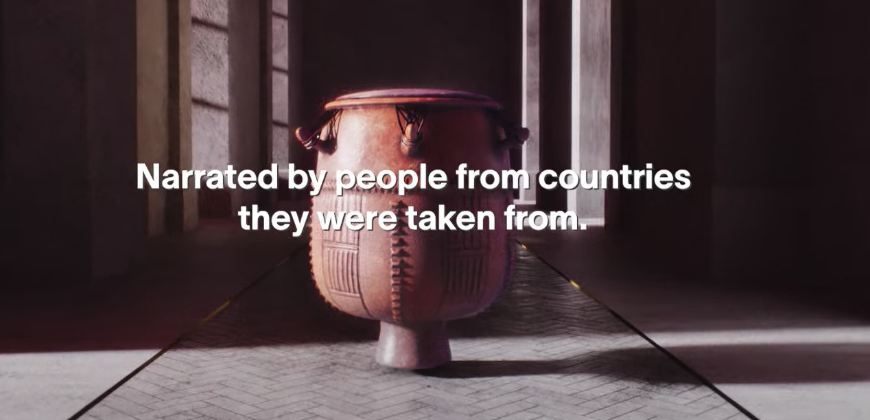 “Take a tour of the British Museum’s disputed artifacts,” the text in the video reads in a later scene. “Narrated by people from countries they were taken from.”